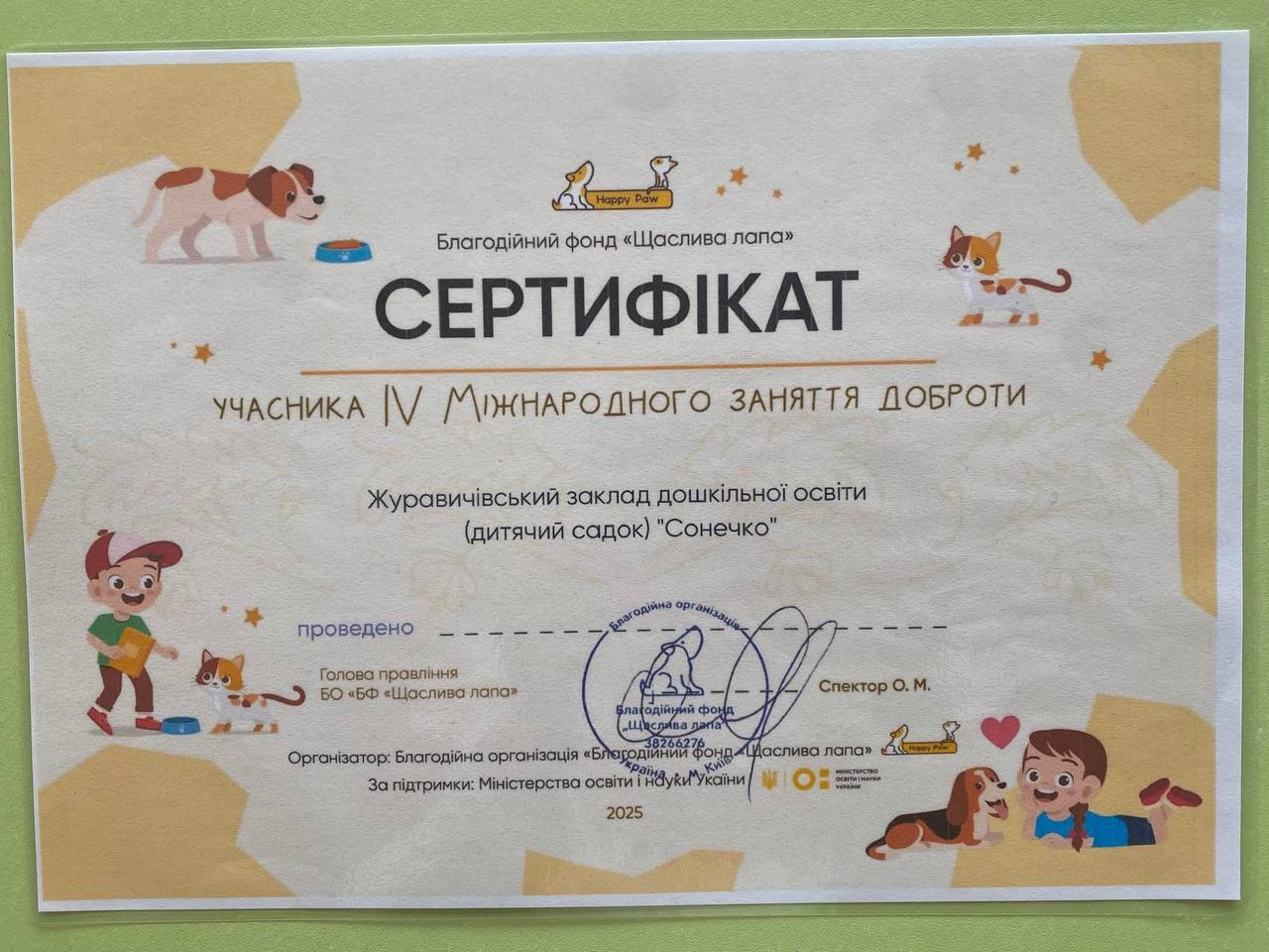 Наш ЗДО «Сонечко »🌞отримав сертифікат учасника IV Міжнародного заняття доброти від благодійного фонду «Щаслива лапа»